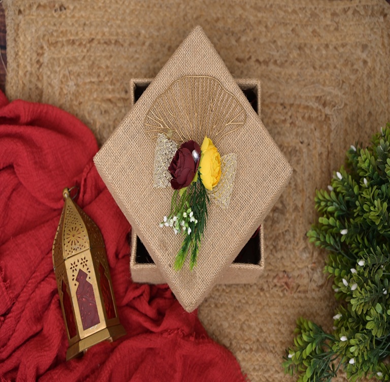 Elevate your gifting with our exquisite jute box! Delicately adorned with foam flowers and intricate cotton thread designs, this eco-friendly box adds an elegant touch to any occasion. Perfect for weddings, birthdays, and special events, its beauty and craftsmanship make it a treasured gift