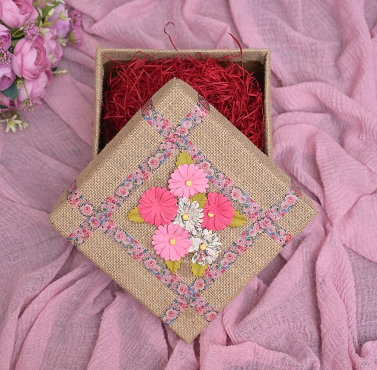 Indulge in the sweetness of pink with our one-of-a-kind jute box! Adorned with delicate pink flowers and a matching satin ribbon, this eco-friendly box is a dream come true for pink lovers. Perfect for birthdays, anniversaries, or just because, it's a thoughtful and charming gift.